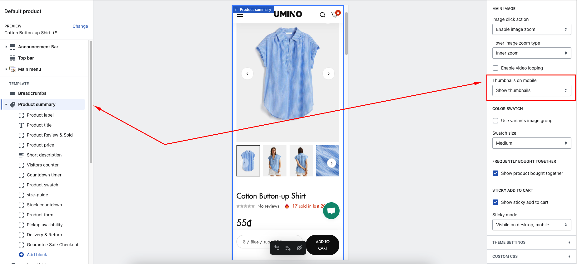 Step : Go to the Product page > Default product > Product summary > Thumbnails on mobile -> Select option show thumbnail or show navigation