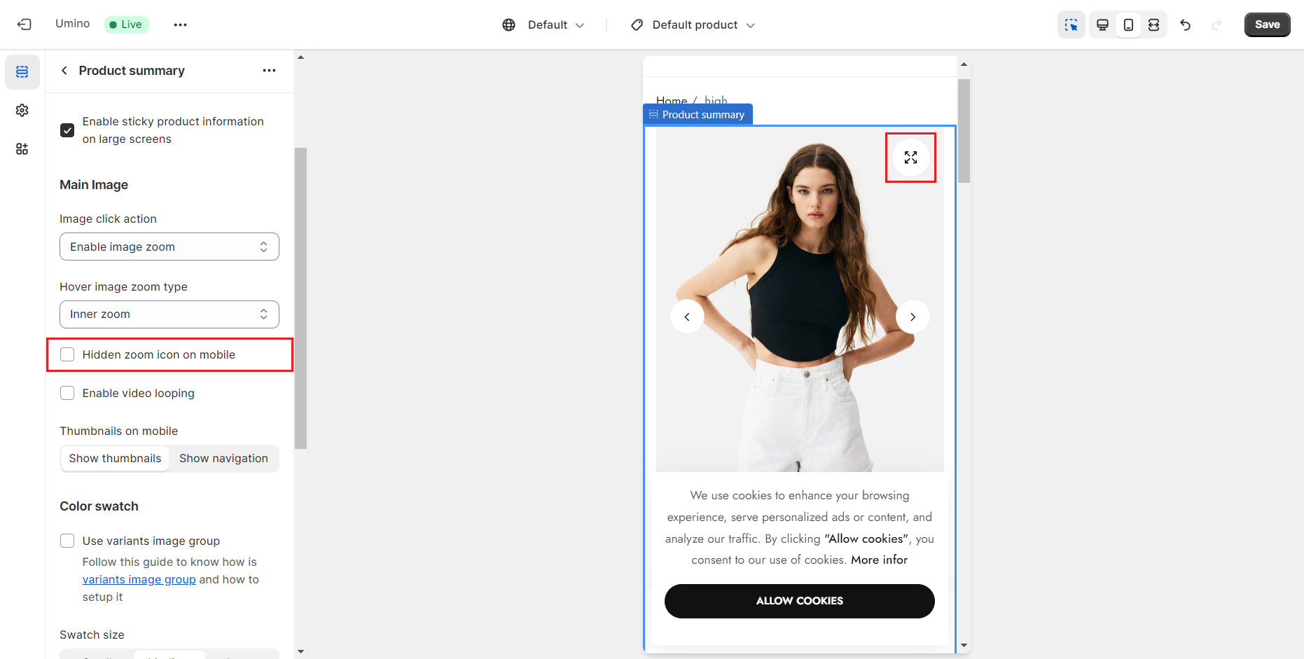 Hidden zoom icon on mobile: enable this to hide the zoom icon on mobile devices.