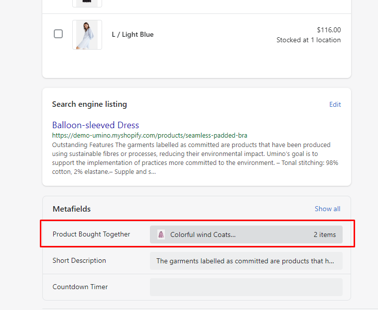 Show product bought together: This option will show product bought together. You can change it please click Products -> Select product that you want to change -> Metafields -> select Product Bought Together