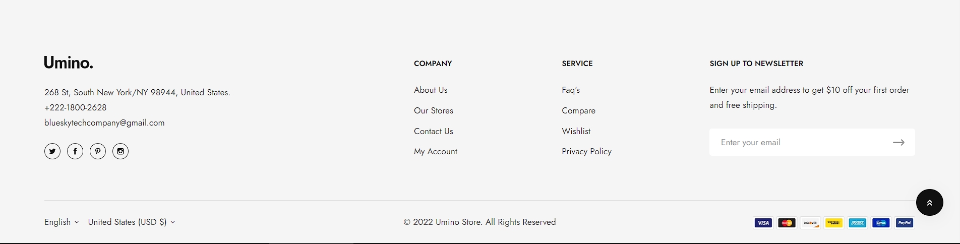 The footer is the section of content at the bottom of a web page. The footer menu typically contains quick links to your homepage, about us page, blogs page, contact page, policy page, etc.