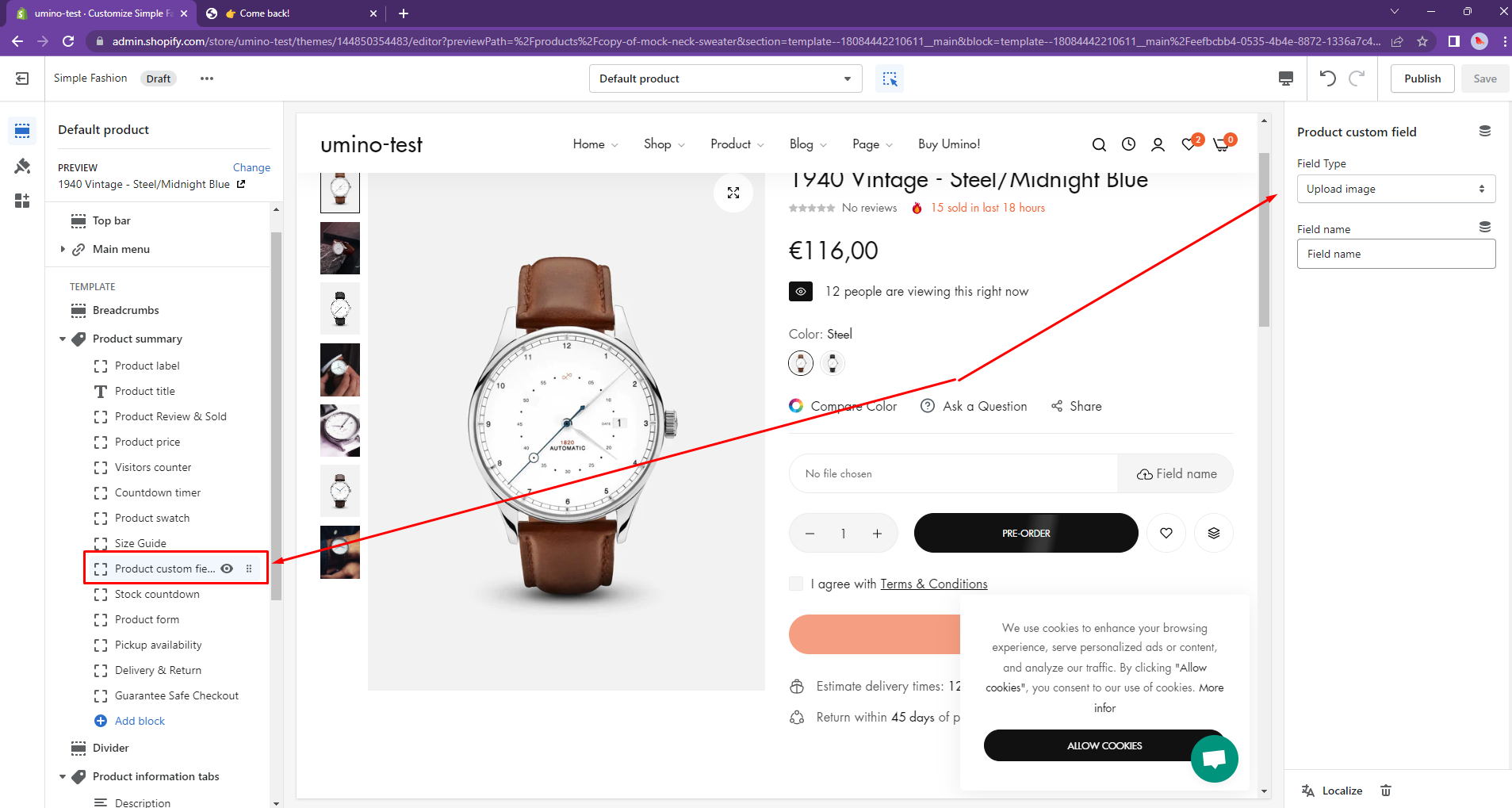 Product custom field: Add the Text block to the Product main option, then drag it to any position that you wanna show it.