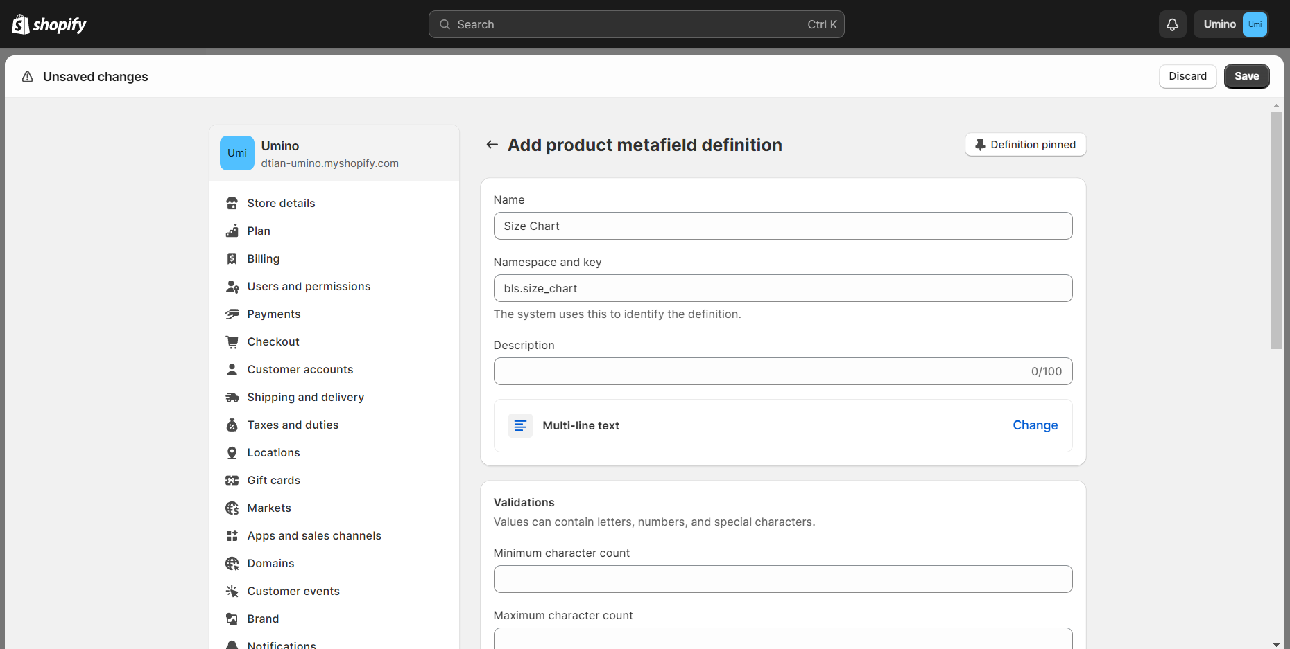 1. Create Size chart metafield