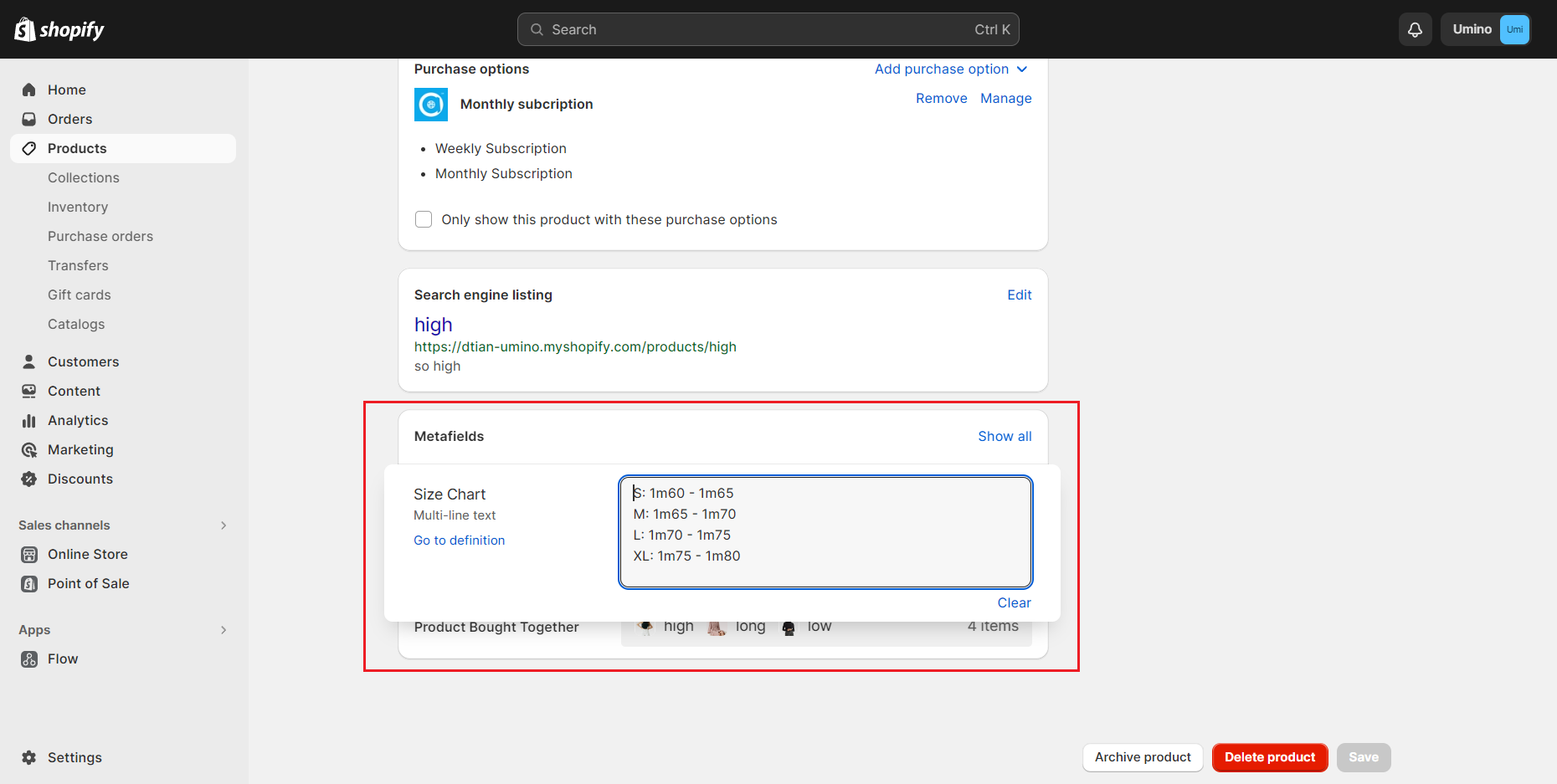 2. Add Size chart metafield to products