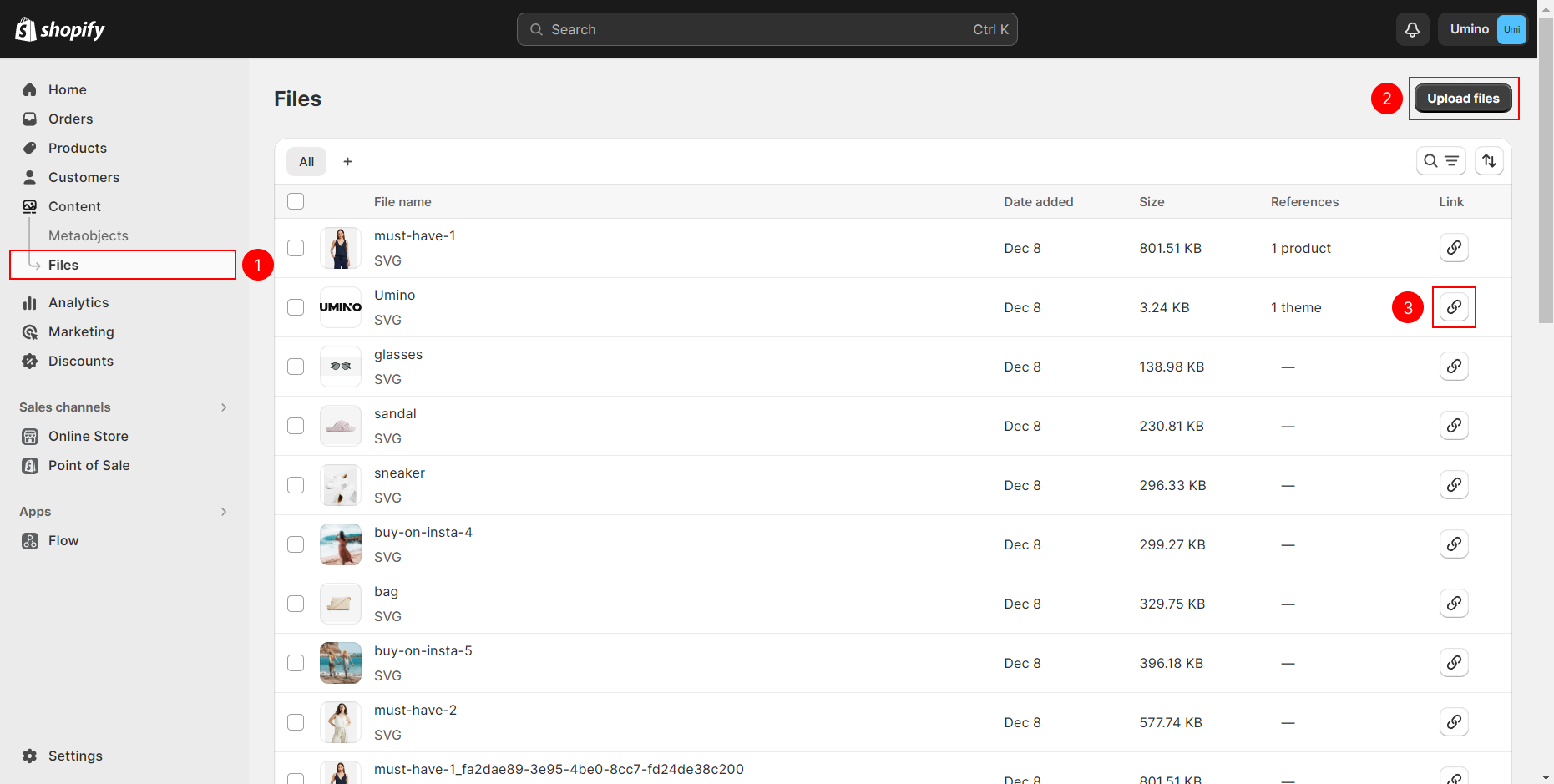 Add the Image: Navigate to the left-side bar on the Shopify Admin, go to Content, select Files, and then click on Upload files to upload your brand image.