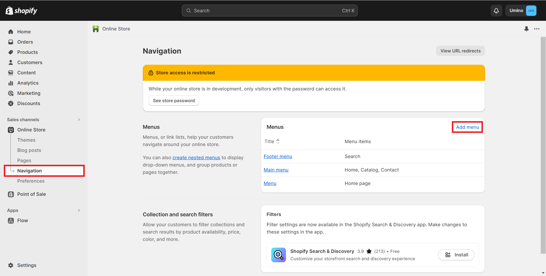 Return to the Shopify Admin, navigate to Online Store, select Navigation, and then click on Add Menu.