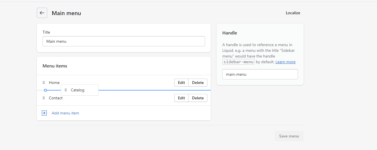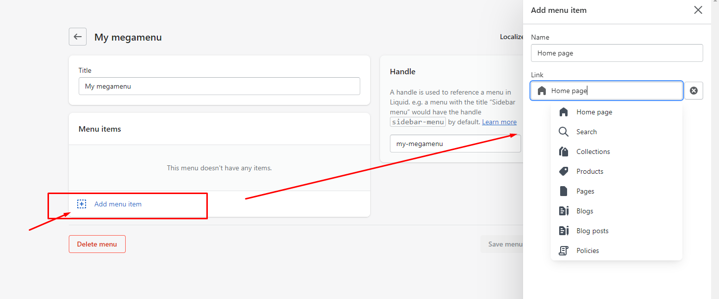 Write the menu's name, then choose Add menu item. Write the menu item's name and choose the item in the dropdown box > click Add.