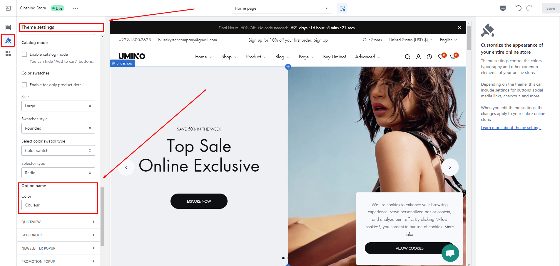 Click to Theme setting icon, select Product and scroll down to Option name