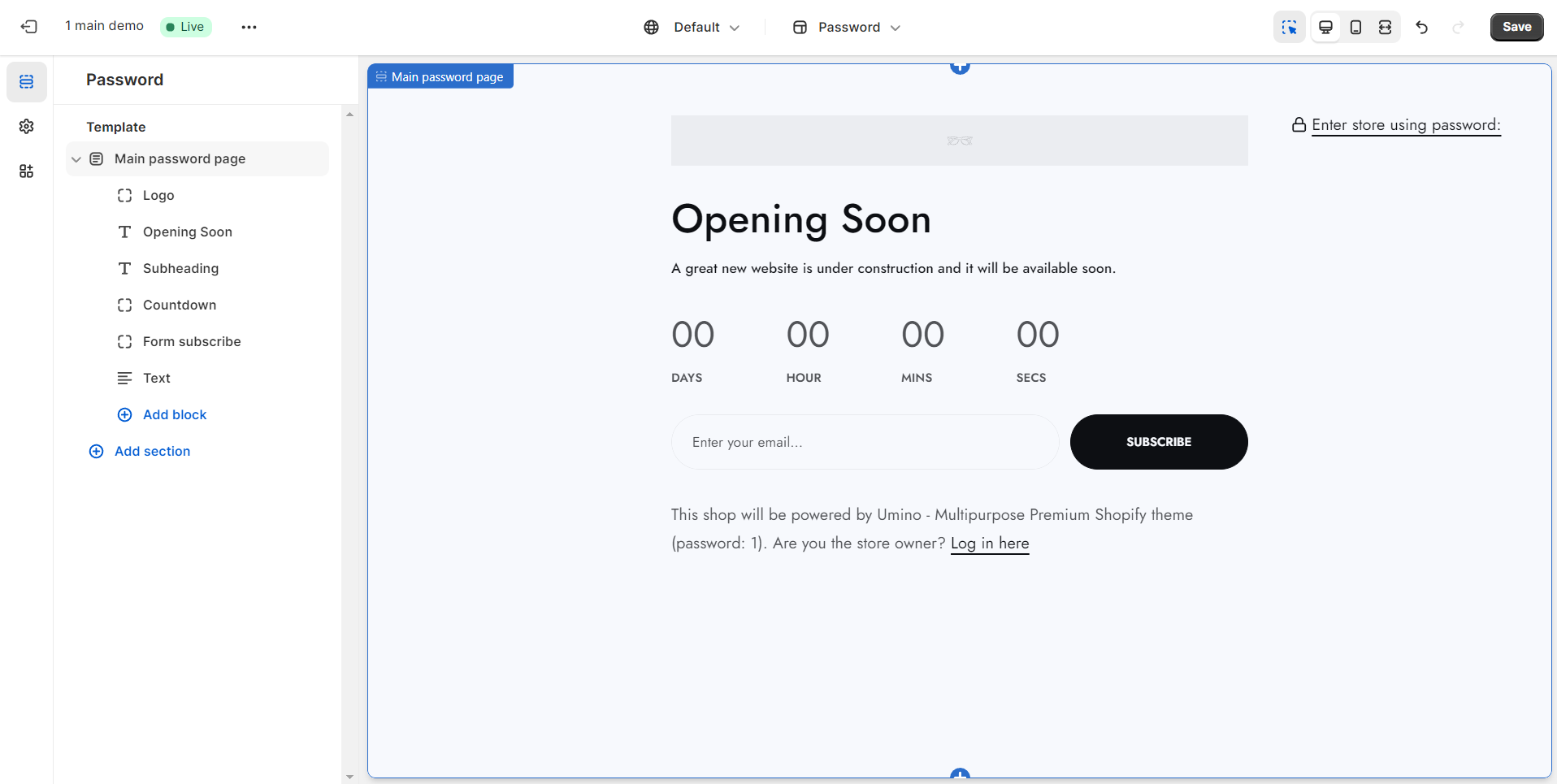 A landing page that adds password protection to merchants' online stores in case they are not yet ready to go live.