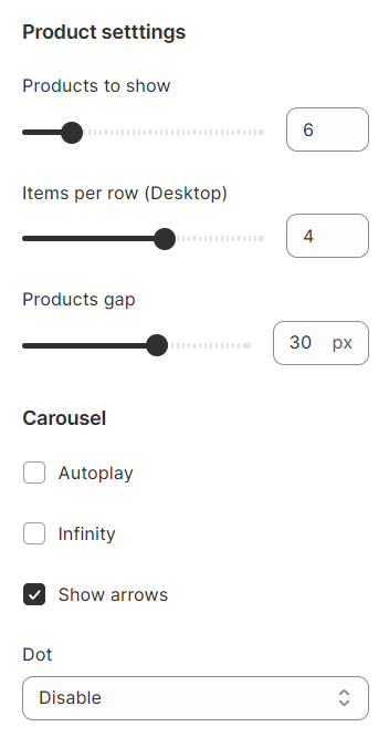 Products per row (between 1 and 4), and the column gap (between 0 and 50)