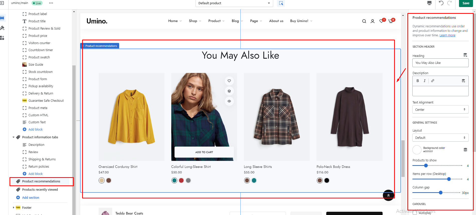 Products per row (between 1 and 4), and the column gap (between 0 and 50).