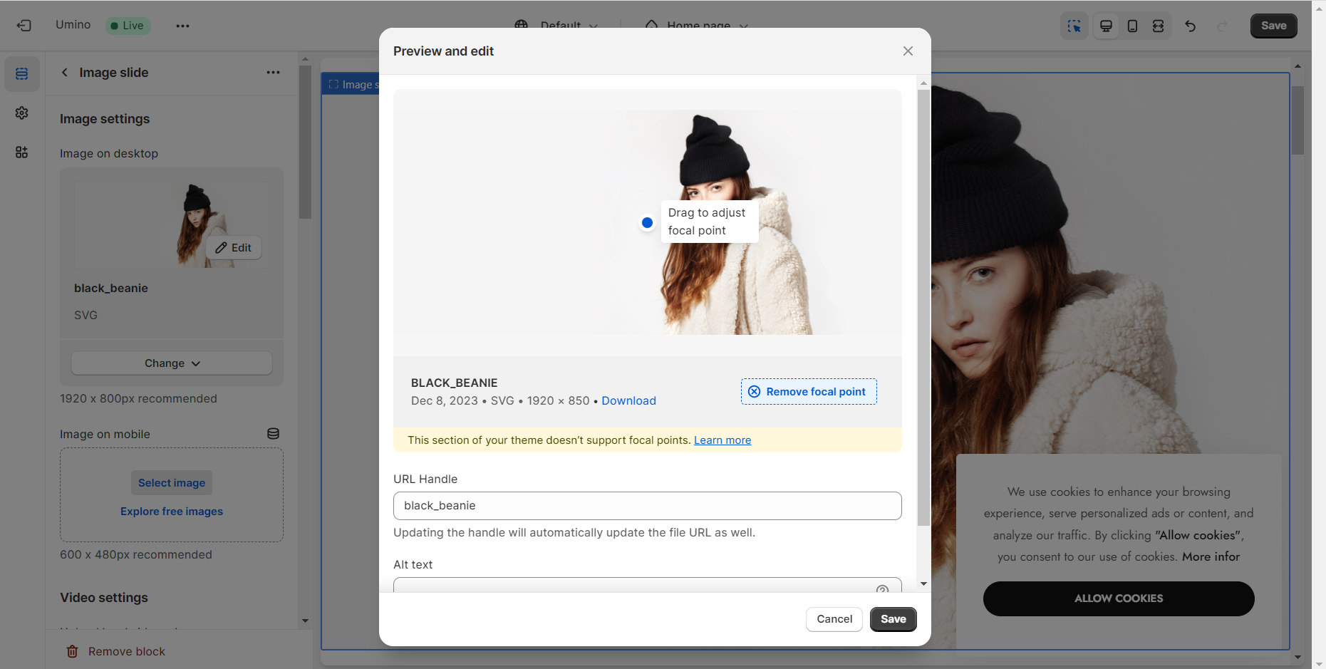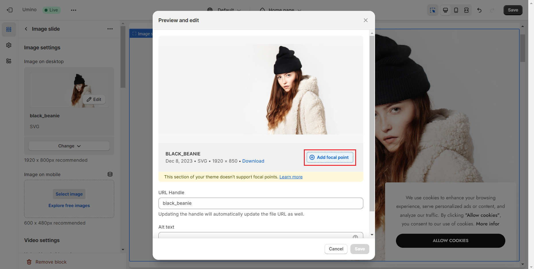 Add focal point: This feature helps you select the most important part of an image for your store. It ensures that the focal points of the image always remain visible, even if a section crops the image to fit the layout.
