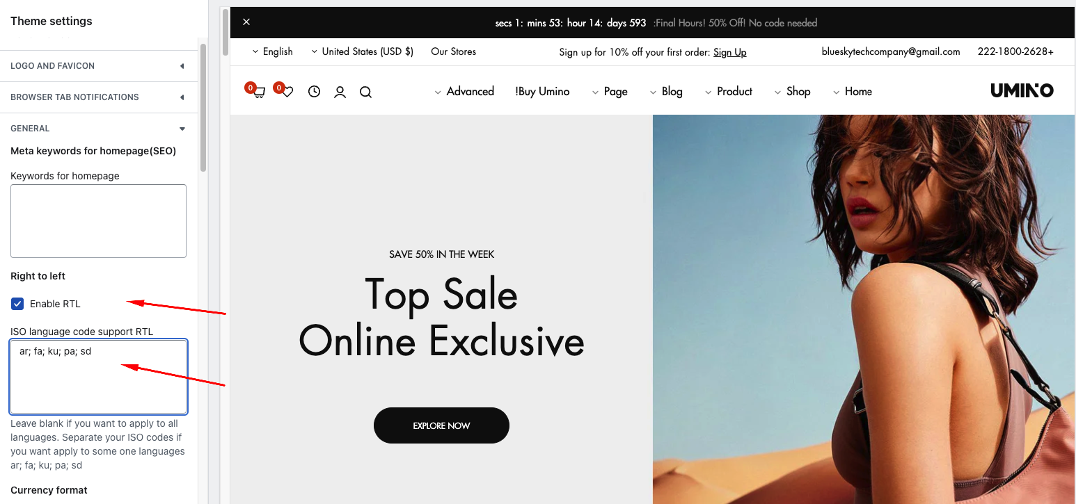 ISO language code support RTL: This option enables the right-to-left (RTL) display of the theme based on the entered language codes. It ensures that the content is rendered correctly for languages that are written from right to left.