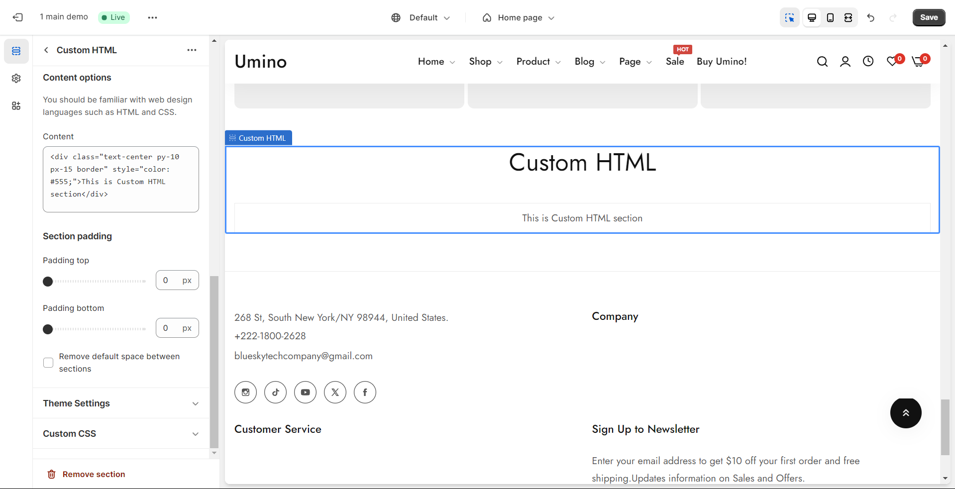 Custom HTML is a section allows you to build up your own space on your website. However, it requires you to be familiar with web design languages (such as HTML, CSS,...) to take advantages of it.