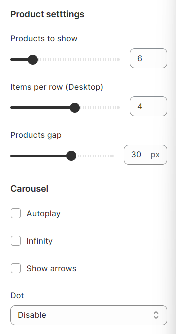 Adjust the number of shown products (between 1 and 30), products per row (between 1 and 4), and the column gap.